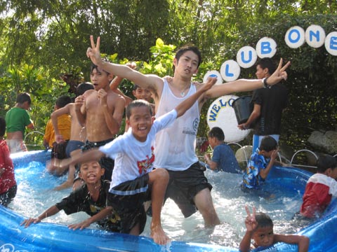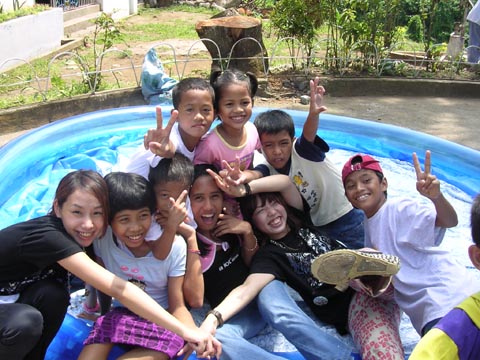 ランチの後は、いよいよ「水のイベント」である。 各グループが、胸を期待に膨らませている子供たちのために一生懸命準備をする。 チョコバナナ、ボーリング、ビーチバレー、ゼリー、アイス、的あて、水あめにスイカ割り。 そして何といっても、おっきなビニールプールが2つ。 消防車を呼んで水入れするくらいの大掛かりなイベントである。